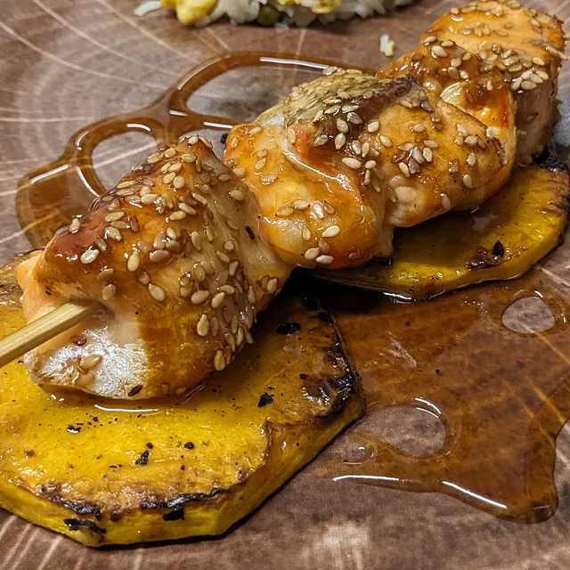 - Pavé de saumon rôti au yuzu et sésame sauce aigre douce, riz cantonais
